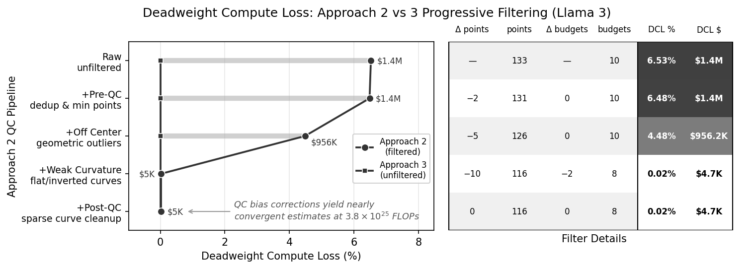 We further substantiated that claim by coming up with an IsoFLOP data quality control pipeline designed to compensate for some Approach 2 biases. Applying this pipeline quickly leads to convergent estimates across fitting methods: